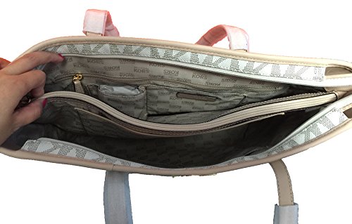 This Michael Kors medium size multifunction tote is as versatile as it is stylish! It is made from vanilla pin dot monogram print PVC with a buff leather trim and polished golden tone hardware. The offers a fully zippered top closure to secure all of your necessities. The interior has two main open compartments divided by a zipper padded compartment specially designed to hold your laptop or tablet. Each of the compartments are lined in a tone on tone Michael Kors monogram print fabric with leather trim. The front section offers two smaller slip pockets and a large open slip pocket, while the back section includes a zippered pocket and two open slip pockets. It features double buckled shoulder straps with a comfortable 8.5" drop, and a hanging Michael Kors circle logo charm. Overall measurements of approximately 15" (L) at the bottom x 17" (L) at the top, x 10" (H) x 5" (W)Feature