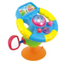 - Feature : 360 degree turnable and adjustable steering wheel with mirror / Realistic car sounds: engine starts, speed ahead, reverse backwards / Includes 3 melodies and 3 honk sounds / Suction cup on bottom attaches to flat surfaces / Steering wheel measures 6" in diameter