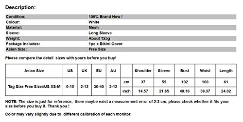Feature : Summer Beach Swimsuit Bathing suit Cover up Shirt Top / Made of Mesh,High Quality Guaranteed / One size fits most US XS-M:Shoulder:14.5";Sleeve:21.6";Bust:40.1";Waist:39.3";Length:24" / It is sexy, chic and casual with summer beachwear / Package including 1pc x Swimsuit Cover up(swimsuit and other accessory is not included)