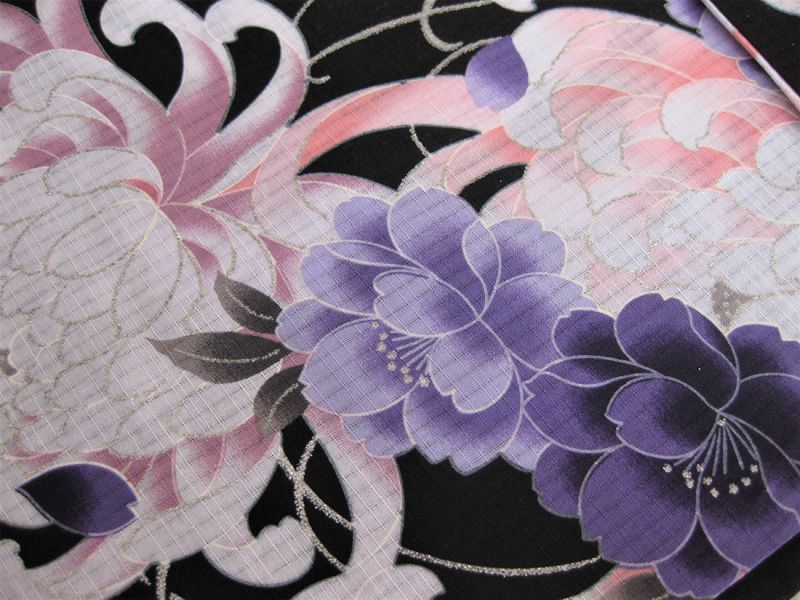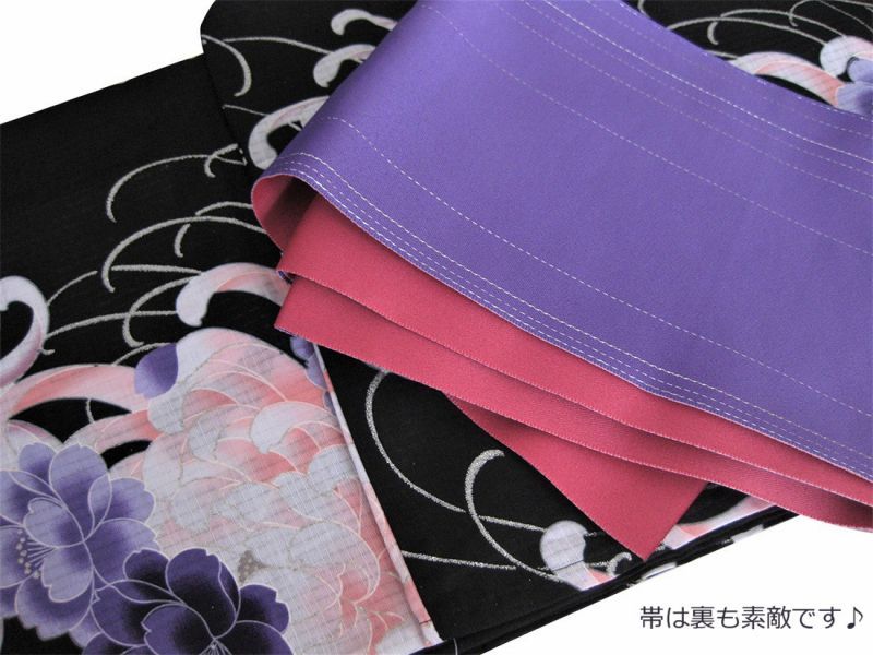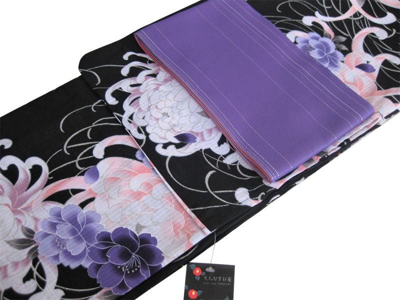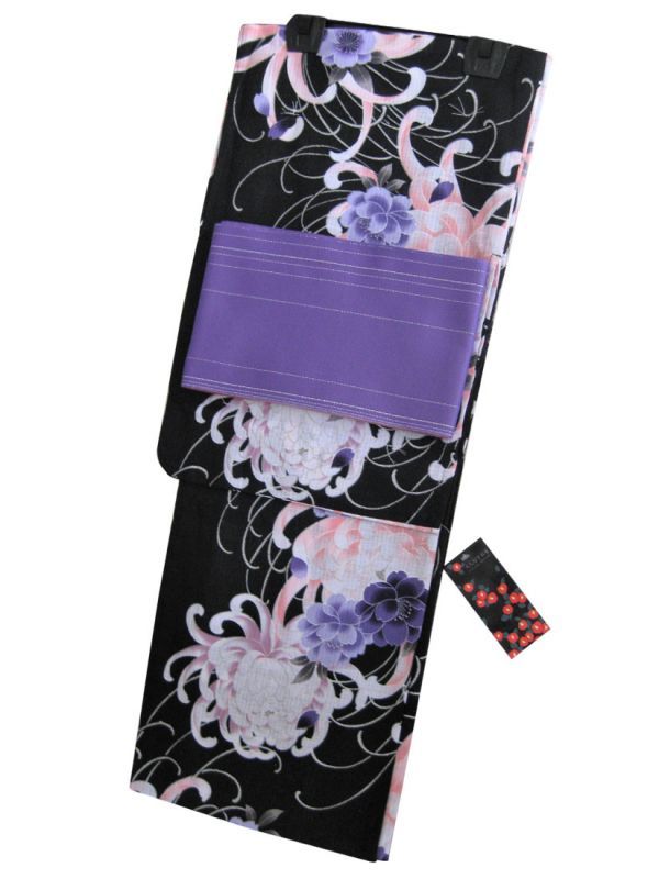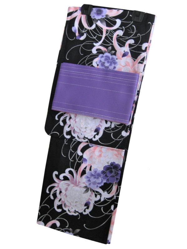 | 色 | 浴衣(黒地にピンク、紫の乱菊柄 シルバーラメ入り) ゆかた帯(紫地にシルバーラメ入り) |