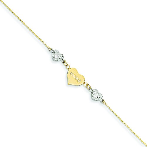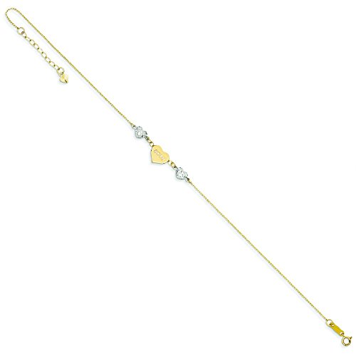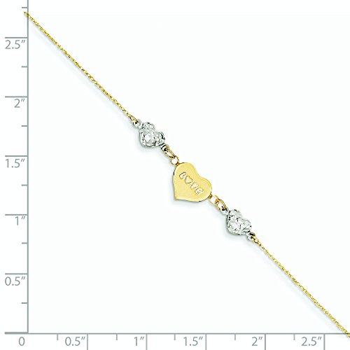 14k Two-Tone Gold Ropa Diamond-cut Beads Puff Heart Love With 1inch Ext Anklet - 9 Inch - 1.1 Grams in 14k Yellow Gold and White Gold - JewelryWeb Style: QTA213044YW - FREE gift-ready jewelry box
