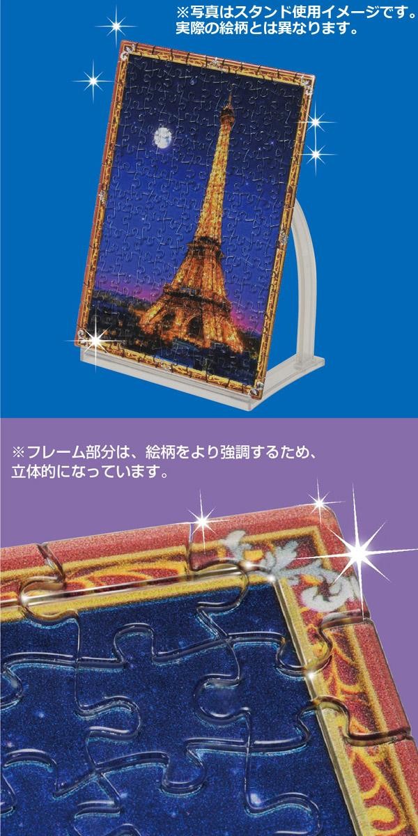 透明のピースを組み上げるジグソーパズルです。ピース同士がしっかりはまるフレーム一体型で、のり付け不要。完成後は付属スタンドに立てて窓辺やテーブルに飾るだけで、ステンドグラスのように、美しく輝くインテリアとして楽しめます♪ |