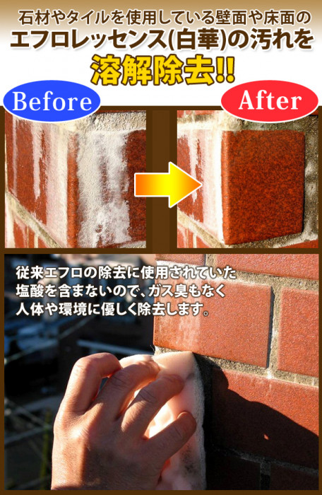 | 石材やタイルを使用している壁面や床面のエフロレッセンス(白華)の汚れを溶解除去します。従来エフロの除去に使用されていた塩酸を含まないので、ガス臭もなく人体や環境に優しく除去します。 |