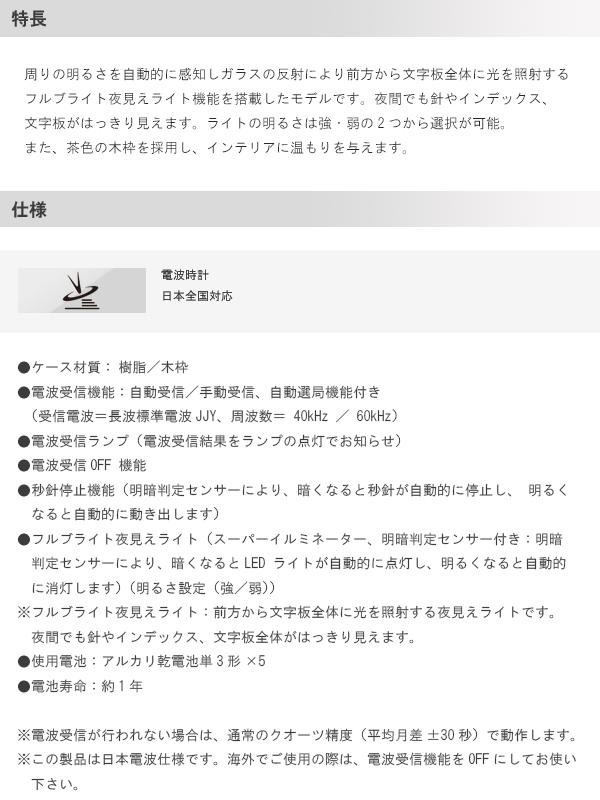 | 周りの明るさを自動的に感知しガラスの反射により前方から文字板全体に光を照射するフルブライト夜見えライト機能を搭載したモデルです。夜間でも針やインデックス、文字板がはっきり見えます。ライトの明るさは強・弱の2つから選択が可能。また、茶色の木枠を採用し、インテリアに温もりを与えます。 |