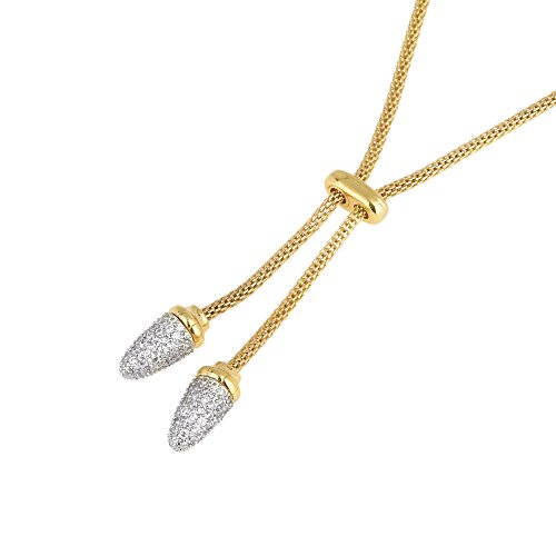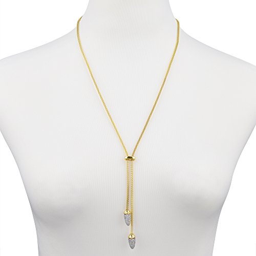 Features two drops with pavé clear CZ, intricately suspended in a lariat style.