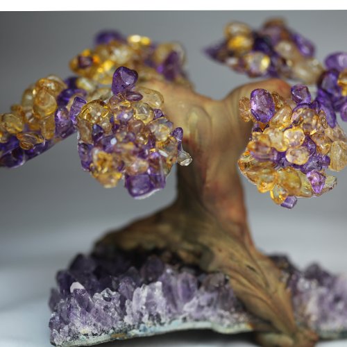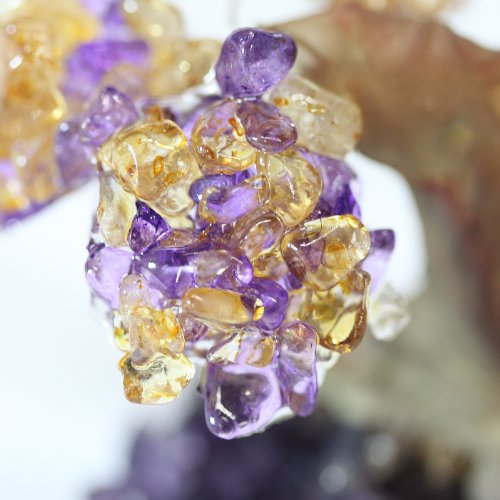 -. Binding : Kitchen -. Brand : Beverly Oaks -. Color : Orange -. Feature : Beautiful Purple Amethyst and Citrine Natural Gemstones / Hand Crafted / Rich Rosewood Sculpted Trunk / 3D Tree sculpture / Citrine Leaves and Amethyst Leaves -. PackageQuantity : 1 -. ProductGroup : Home -. ProductTypeName : HOME -. Title : New Citrine & Amethyst Geode Crystal Cluster Wire Tree of Life Art Twin Spirit Tree