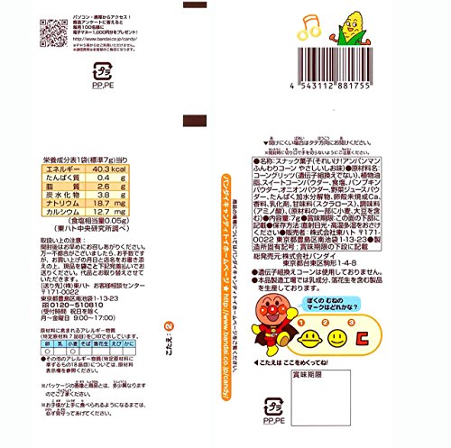 原材料:コーングリッツ(遺伝子組換えでない)、植物油脂、スイートコーンパウダー、食塩、パンプキンパウダー、オニオンパウダー、野菜ジュースパウダー、たんぱく加水分解物、卵殻未焼成Ca、香料、乳化剤、甘味料(スクラロース)、調味料(アミノ酸)、(原材料の一部に小麦、大豆を含む)