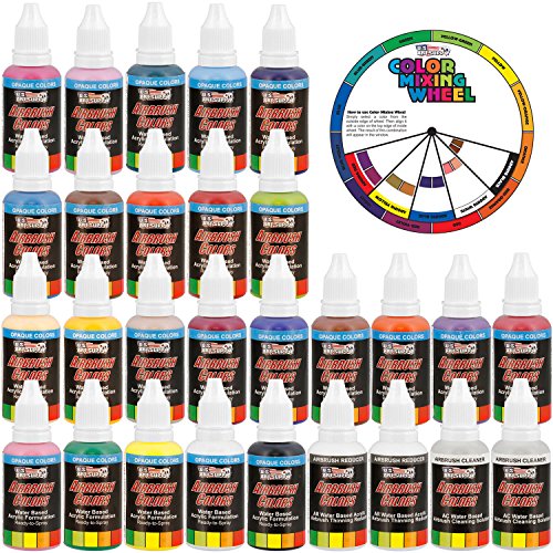 US Art Supply 24 Color Acrylic Airbrush Paint Set Opaque Colors plus Reducer, Cleaner & Color Mixing Wheel