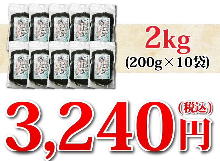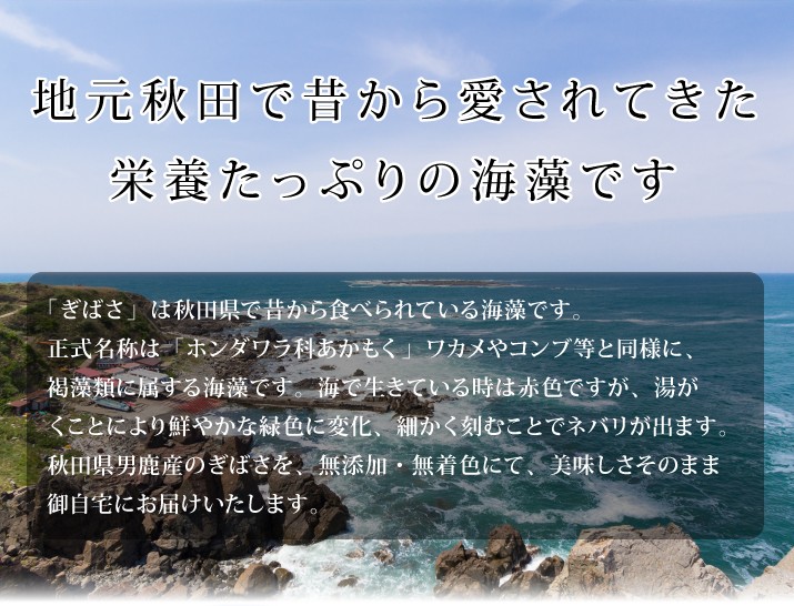 | 商品内容 | 秋田県男鹿産ぎばさ(アカモク)200g×10袋 原材料:冷凍ぎばさ(アカモク) 産地:秋田産 |