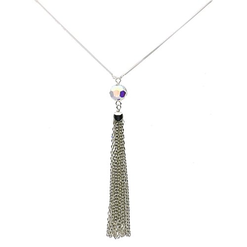 Aurora borealis crystal bead tops the sterling silver cable chain tassel. Made with Swarovski Crystals. Tassel hangs approx 3 3/4 inches long. Curb chain necklace. Chain length is measured from loop end to clasp end. Metal components are sterling silver. Tassel is not removable. Gift box included, color or style may vary.Feature