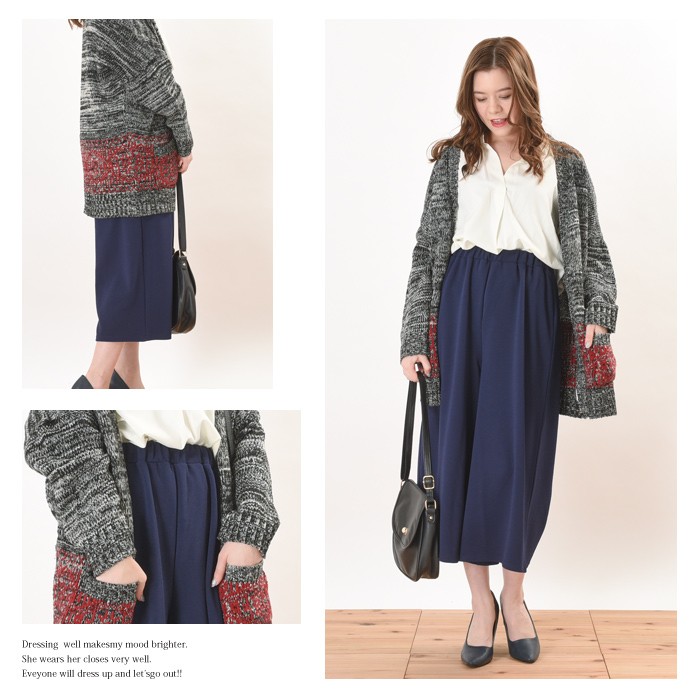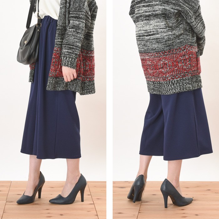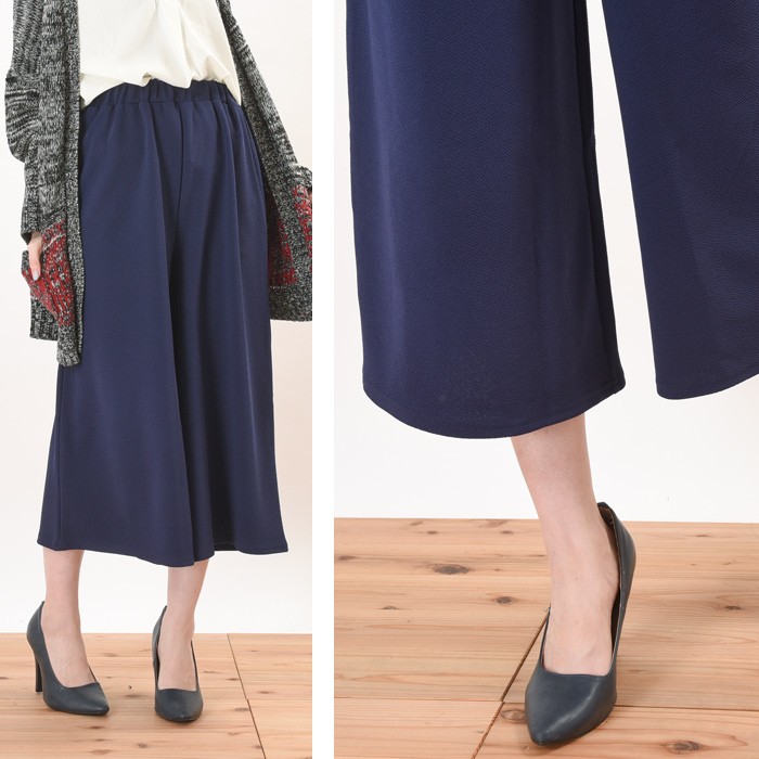 立体的な生地感で、ふっくらとオシャレな雰囲気のふくれジャガード生地のガウチョパンツです。無地でシンプルなデザインなので、着回しがしやすく幅広いコーディネートに使えてワードローブにお使いいただけます。また、ゆったりとしたシルエットで体型カバーもしっかりとできて今年らしい大人気のデザインです。ウエスト部分には、ゴムが入っているので着心地楽ちんで、お出かけ着にはもちろんのことお部屋着にもお使いいただけます。
