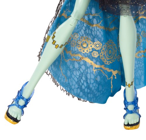 Frankie Stein doll’s party dress is designed in her signature blue, black, and white and features a long sparkly train with gold detailing. Her to-die-for outfit features a twisted halter and lightning-bolt accents that add a jolt of high drama. What could be more fierce? She accessorizes this ultra-glam outfit with strappy shoes, bracelets, earrings, and a matching headpiece. To top off her killer ensemble, Frankie Stein wears spooktacular makeup and sports special gold stitches and bolts for the occasion. Plus, her long, flowing hair is styled with gore-geous gold detailing and colorful streaks to match her fashions and lantern. This creepy-chic look is a scream come true.Girls can play out spine-tingling scenes from the movie Monster High 13 Wishes and invent their own adventures with this Frankie Stein doll. To expand the fashionable fun, collect all the dolls in the assortment, including Draculaura and Clawdeen Wolf (each sold separately). Your ghoul will shriek with delight.