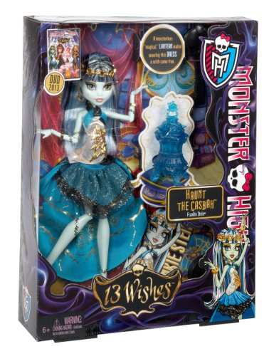 It’s time for a dance party — Monster High style. The ghouls of Monster High are all dolled up in genie-inspired fashions, as featured in their frightfully fun new movie Monster High 13 Wishes. Frankie Stein doll electrifies this look in an over-the-top outfit adorned with golden jewelry — even her bolts and stitches are gold. She comes with a brush, doll stand, and lantern accessory to help create a boo-tiful night to remember.