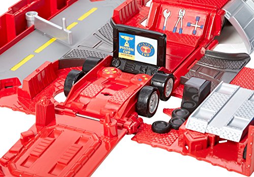 -. Feature : Inspired by Disney/Pixar Cars, this Mack and Transporter delivers two big ways to play / As a transporter, Mack proudly carries Lightning McQueen to places near like Radiator Springs and far like worldwide races / Parked and open, he features multiple play areas big screen TV lounge with Lightning McQueen's trophies, car washing area, a working lift, a viewing deck and a gas pump / Mack's cab can also be detached from the trailer for more push around play / When the day and night's drives are done, roll Lightning McQueen inside and fold Mack back up for easy storage
