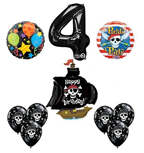 -. Feature : (1) 46 inch Black Pirate Ship Foil Balloon / (1) 34 inch Giant Black Number 4 Foil Balloon / (1) 18 inch Pirate Party Foil Balloon / (1) 18 inch Black Jubilee Foil Balloon / (6) 11 inch Black Latex Balloons with White Skull and Cross Bone P.R.Int