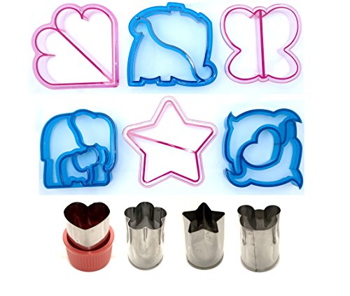 10 DIFFERENT SHAPES THAT KIDS LOVE: 6 sandwich cutters shaped as: Elephants, Dinosaurs, Butterflies, Star, Dolphin and Love, and 4 mini vegetable cutters: Love, Star, Mickey Mouse and Flower. enjoy endless possibilities for a creative meal.