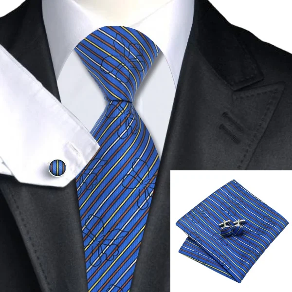 | [해외]SN-968 블루 옐로우 브라운 스트라이프 넥타이 손수건 커프스 세트 남성 100% 실크 넥타이 남성 정장 웨딩 파티 신랑 |