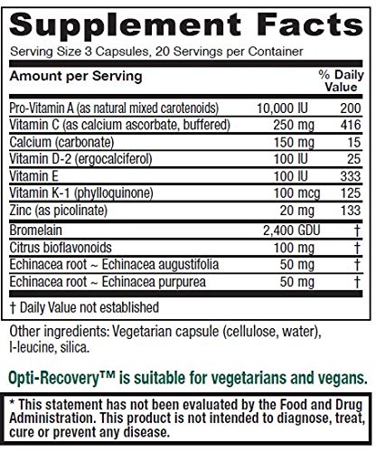 -. Feature : Vitanica Opti-RecoveryTM supports a healthy inflammatory response in the tissues, promoting a healthy recovery after surgery, including dental procedures, and in other situations where tissue support is desired.* / Opti-RecoveryTM is suitable for vegetarians and vegans / Also is suitable for men / This product contains no: preservatives, binders, artificial colorings or flavorings, sugars, lactose, salt, wheat, gluten, soybeans, milk derivatives, eggs, peanuts, tree nuts, fish or shellfish.