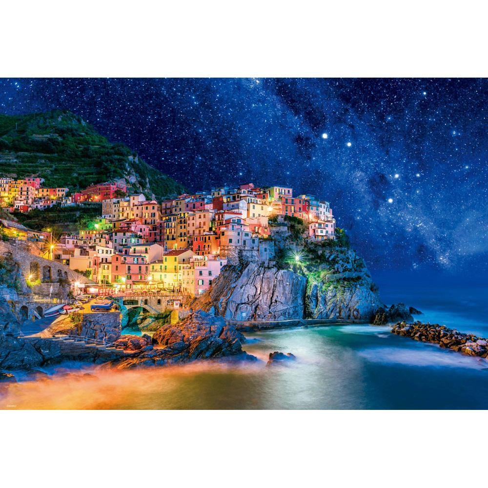 色とりどりの家屋のライトアップと瞬く星空(イタリア)。美しい絵画のような情景と壮大な景観をジグソーパズルでお楽しみください。蓄光塗料を用いているためパズルの絵柄に光をあてた後、暗い場所で蛍光を発します。 |
