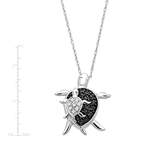 An unorthodox mother and child themed piece with all the sentiment. A smaller white diamond-studded stylized turtle lies on top of a larger black diamond-studded stylized turtle, both crafted in 10K white gold. Piece measures 5/8 by 9/16 inches Comes with a 10K white gold 18-inch rope chain.Feature