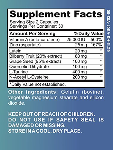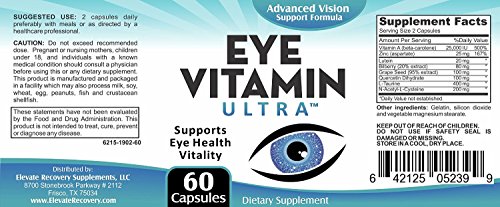 -. Feature : Eye Vitamin Ultra provides inner nutrient support for tired, dry, and irritated eyes / Helps promote better overall eye and vision health / Eye Health and Vitality Supplement / Contains 8 natural eye vitamins/supplements in 1 formula such as: Lutein, Bilberry Extract, Grape Seed Extract, Vitamin A (beta carotene), Zinc, Quercetin Dihydrate, L-Taurine, and N-Acetyl-L-Cysteine / 60 Capsules - 1 Month Supply - Natural Eye Health Supplements/Vitamins