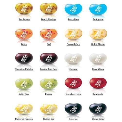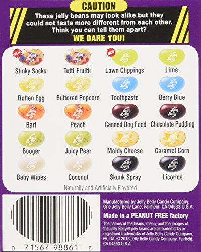 -. Feature : Pack of 48, 1.6-ounces per box (total of 76.8 ounces) / Contains 10 colors of beans, and 20 flavors (10 "real" ones and 10 different ones) / The Black Licorice bean looks exactly like the Skunk Spray bean / Sweet, luscious Caramel Corn might also be Moldy Cheese / The only way to find out what beans you're getting is to eat them