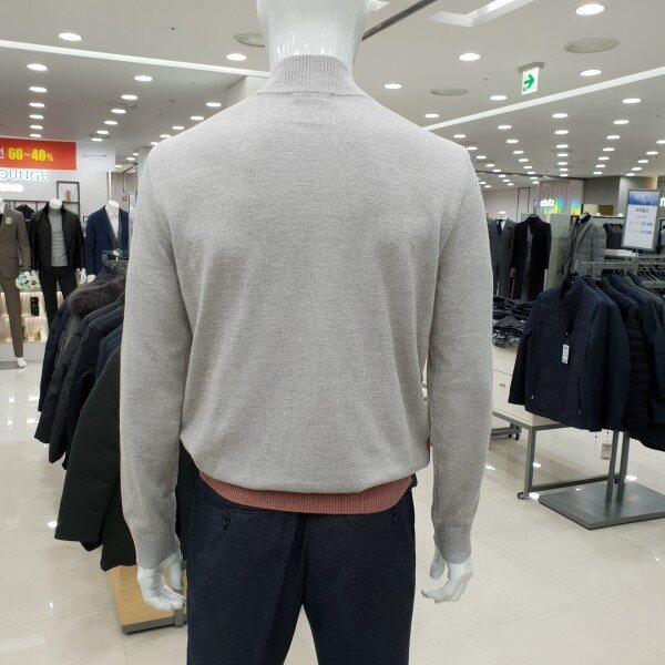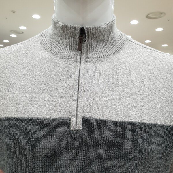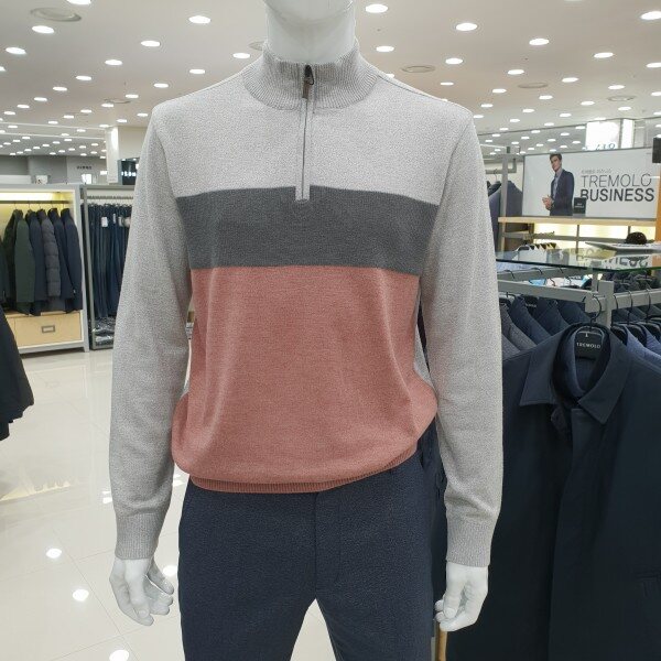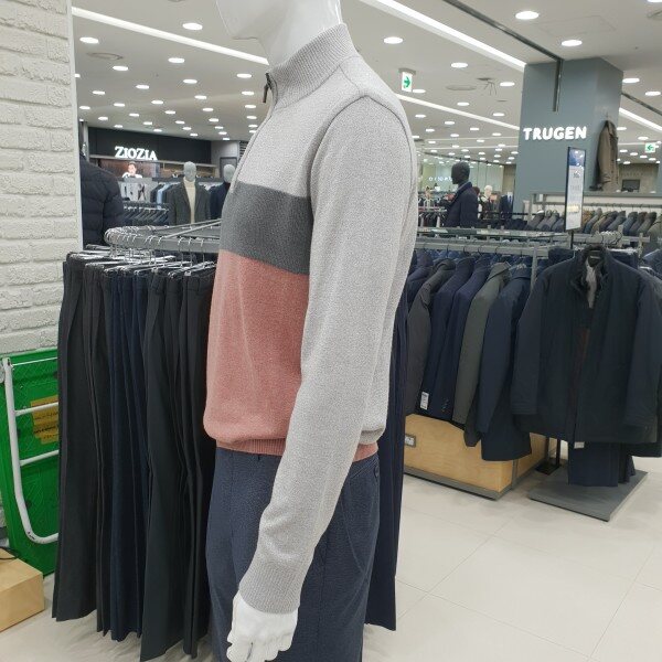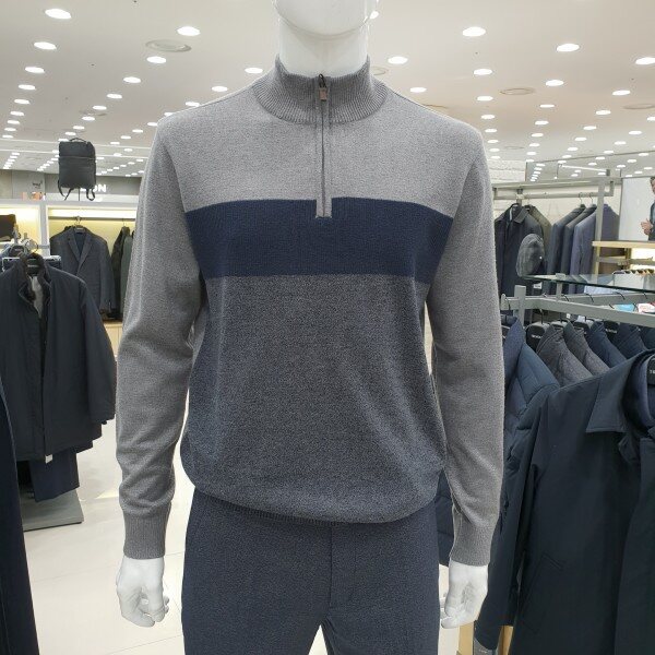 . 컬러 포인트 블럭 디자인의 남성 하프 집업 스웨터입니다