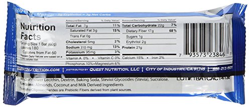 Studio : QUEST NUTRITION Publisher : QUEST NUTRITION Binding : Health and Beauty Product Description It's the perfect nutrition bar for anyone looking to get top quality protein while dropping some carbs from their diet. They're as delicious and convenient as a candy bar, while maintaining all of the nutrition of a carefully prepared meal that's packed with fiber to make you feel full and to help with digestion and weight loss. Available in cookies and cream flavour. 0