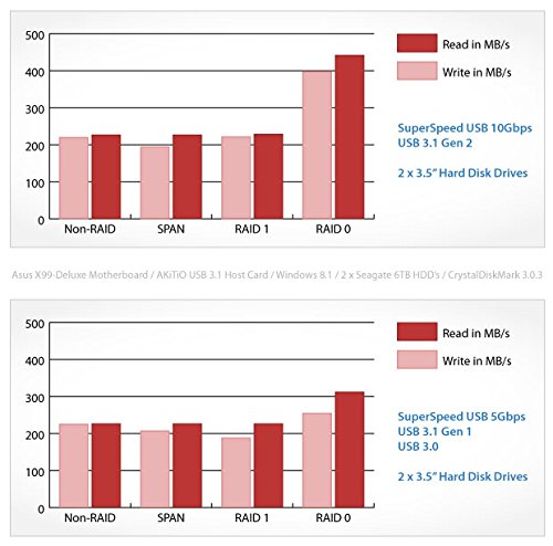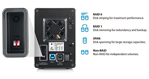 -. Feature : Configurable hardware RAID controller (Non-RAID, RAID 0, RAID 1, SPAN) / SuperSpeed USB 10Gbps (USB 3.1 Gen 2) interface / Backwards compatible with USB 3.0 and USB 2.0 / Extremely compact dual-bay design for two 3.5" drives / Security lock slot & Quiet cooling fan with ON/OFF switch