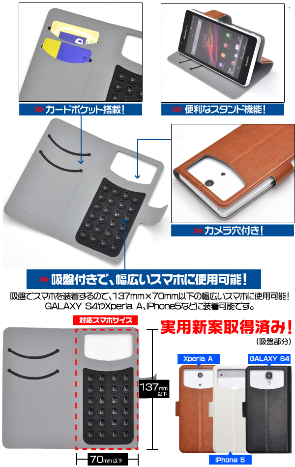 GALAXY S4やXperia A、iPhone5などに装着可能です。