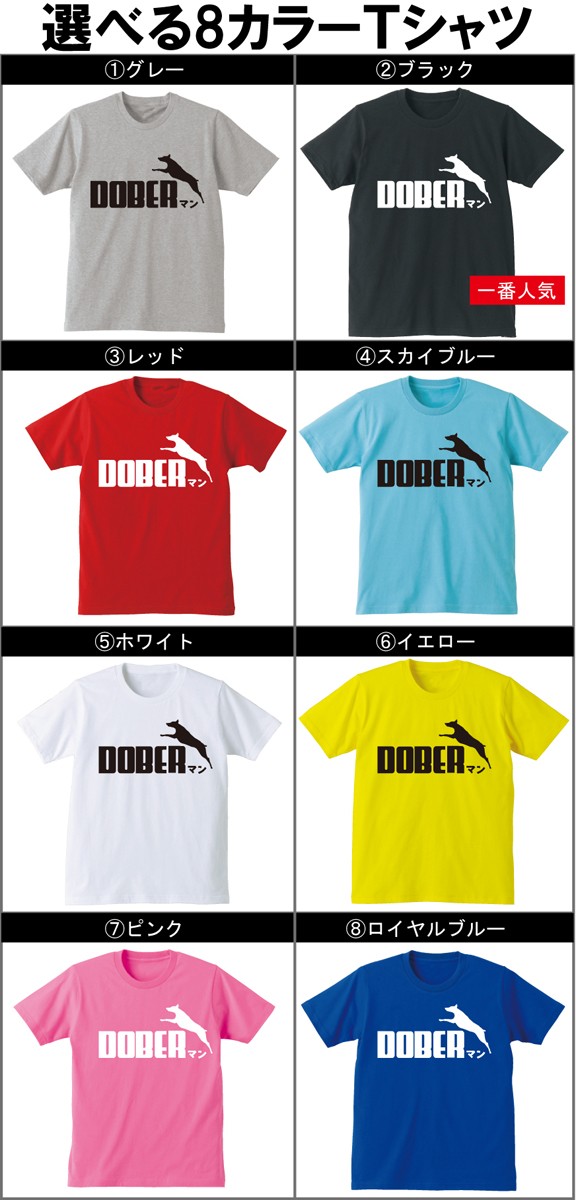 ドーベルマンをこよなく愛する方にお届けしたいtシャツです。ローマ字で「DOBER」の後カタカナで「マン」とデザインされています(笑)ドーベルマンのシルエットはドーベルマンオーナーも納得のデザイン!Tシャツのカラーは8色から選べるようになりました!サイズはキッズサイズから大人用までございますのでお子様にもおすすめ!カップルや親子ペアだと最高にインパクトあります!!!!オフ会や散歩の際は着て行こう!!