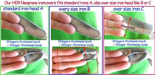- Feature : Part 1: H09 Iron Covers: Best protection available for your expensive golf irons; Fit the most widely used irons in golf today / Machine washable.; Designed to fit your clubs and protect them from the dings and damage that occur during play or travel / Qty: 10pcs; Color: Black/SLiver Grey; Material: Neoprene; For Right Handed; Designed for right handed club irons; universal size - fits most brand exsisted, iron No. may not stay right in the middle of the clear window as it's not a customized product Sometime maybe one third or a quarter No. hide in, in this case one just slightly pull it - it still works / Part 2: 2pcs leash strap 4: Secures 4 Golf Head Covers or Accessories; Attaches to any upper or lower bag ring.; Fits Any Size or Model Head Covers for Drivers, Woods, Hybrids, Putter Head Covers; Attaches to either TOP or BOTTOM of your Head Covers / Stop Losing Golf Head Covers! Our uniquely designed Golf Accessory Leash STRAP Head Cover Leash With Bag Strap attaches to the TOP or BOTTOM of your golf headcovers. With the added length of the strap, secure your head covers or accessories to any upper or lower ring on your any golf bag. When a golf headcover is removed, the golf head cover just dangles from the golf bag until the head cover is put back on the golf club. No more searching the lost and found for your favorite headcover. Our golf head cover leash can be attached to any size or model from Team Effort, Intech, ProActive, Daphne, Butthead, Wilson, etc golf woods, driver, hybrids, putter headcovers via 4 individual leashes with swivel clips to lessen tangle. No golf headcover loops are required. With our exclusive Flex Setup TM and Multi-Purpose Reversable product designs, you can create multiple golf accessory combinations and bag locations.