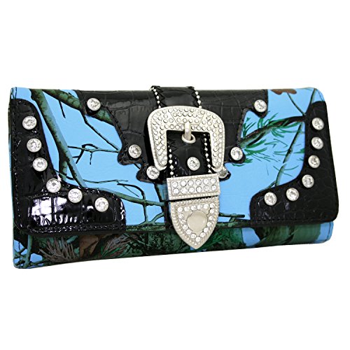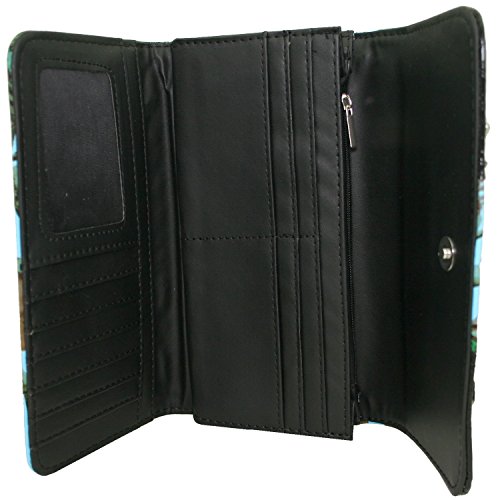 Wallet: Made of high quality faux leather. Trifold wallet secured by magnetic snap. Rhinestone buckle accent. Transparent ID window. 10 credit card slots.