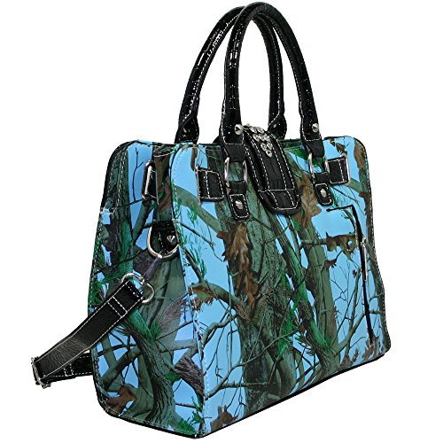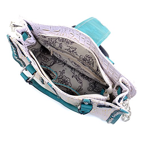 vintage floral lined interior. Interior features a back wall zip pocket & front wall multifunctional pockets. Exterior feature 1 back zippered concealed handgun pocket. Mixed studs & rhinestones on the trim.