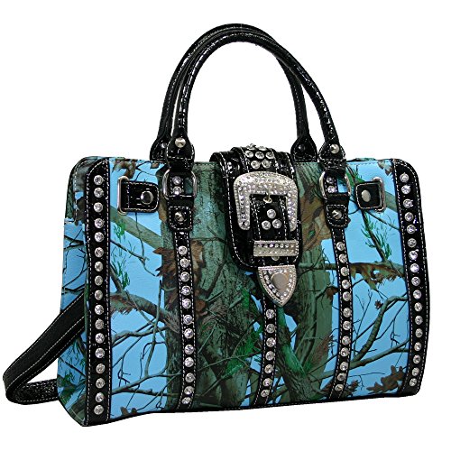 Beautiful satchel bag with removable long strap 45'' end to end. Made of high quality faux leather. Rhinestones belt buckle accent on front.