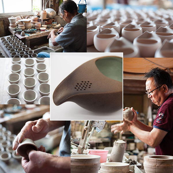 ●急須本体に職人が一つ一つ手作業で茶こし穴を開けました。異素材の茶こしを使わないため、お茶の風味に影響を与えることがありません。