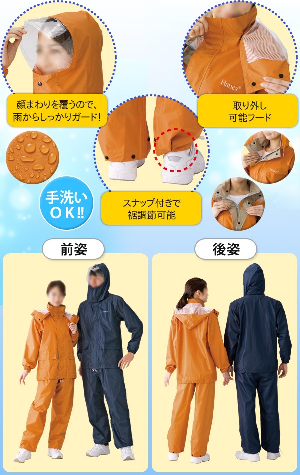 上下セパレート型のレインスーツ。内側はメッシュ生地素材で蒸れを防ぎ、フード部分は取り外し可能。