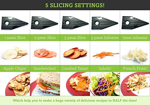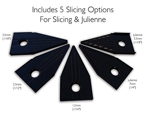- ✔QUICK & EASY TO USE. 5 in one cutting system, Cut your fruit and vegetables quickly and easily into uniform slices or Juliennes with the V-blade slicer. Five interchangeable slicing inserts allow you to create professional looking slices or juliennes for different occasions. Includes 1.6mm grater, 1.5 mm slice, 2.5mm slice, 3.5mm Julienne and 7mm Julienne. 7mm is also great for making perfect French Fries!!