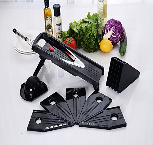 URBAN DEPOT Chef Grade Mandoline V-Blade Slicer,, 5 Interchangeable Blade Inserts,Grater,Cutter,Hand Guard, Deluxe Heavy Duty ABS Plastic Construction. Best Price!