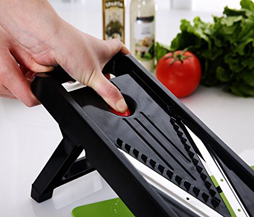 - ✔SAFE TO USE & EASY TO CLEAN. Hand safety guard included. Non slip design. Includes a blade caddy so you can store unused blades safely. After use simply rinse under a running tap to clean. Dishwasher safe. Includes Blade insert caddy for easy organization and nonslip foldable back leg for compact storage. Hand guard securely holds the food for stable slicing and finger protection. Non-skid stand for ultra-stability while slicing.