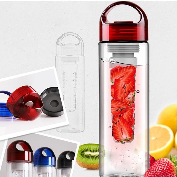 Enjoy the taste and health benefits of your favourite fruit all day long. This durable plastic water bottle has an insert that holds fruit, and allows the taste to mix with the water around it. Loop allows for easy carrying. Available in 3 colours. Rubber gaskets prevent any leakage regardless of bottle position.