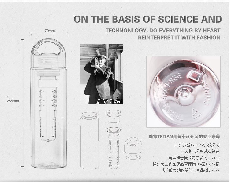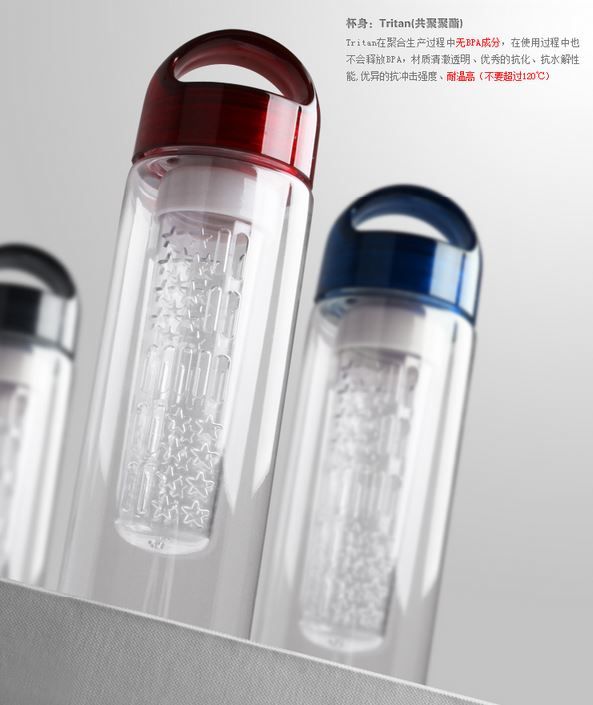 Tritan Plastic fruit juice botle/ Using U.S. Tritan Plastic. BPA free which fulfill the environmental standard. It is antirust and odour-free. Just put the fruits into the filter, making fruit water will be the easiest job. Being healthy person today. 3 colors available.