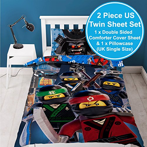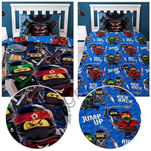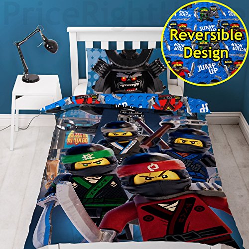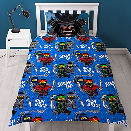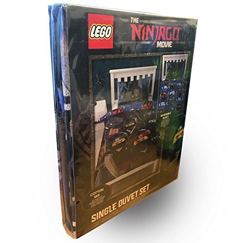This Lego Ninjago Movie single duvet cover set makes the perfect addition to any Lego fan's bedroom. The cool design features Ninjas Lloyd, Jay, Kai and Cole in action on the front, with villain Lord Garmadon on the pillowcase. The reverse has the Lego Ninjas in a repeat pattern on a blue Lego brick background. This item is made from a polycotton blend and can be machine washed and tumble dried on a low setting.? 0 |