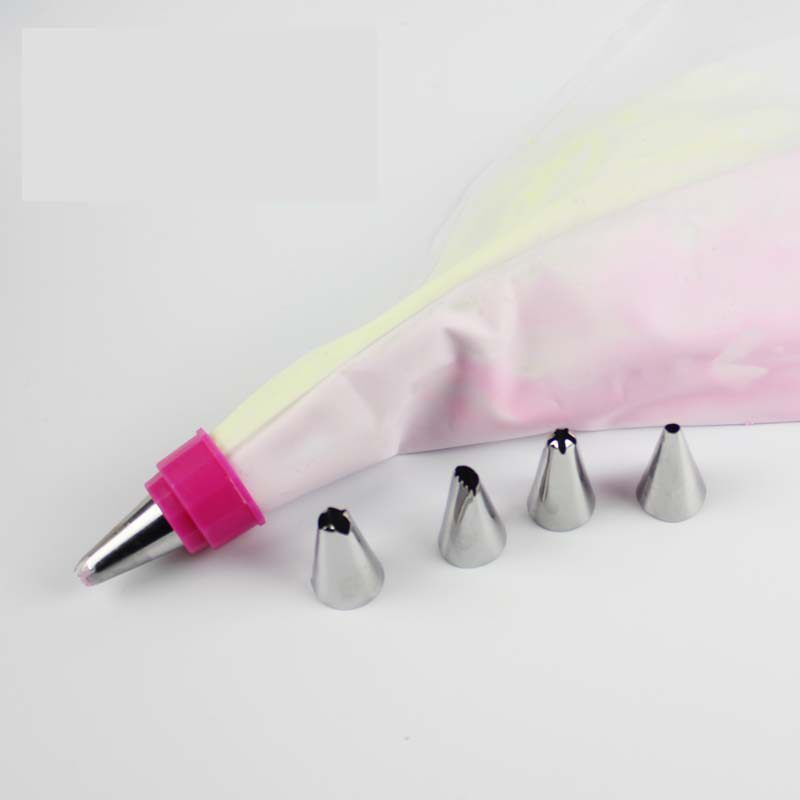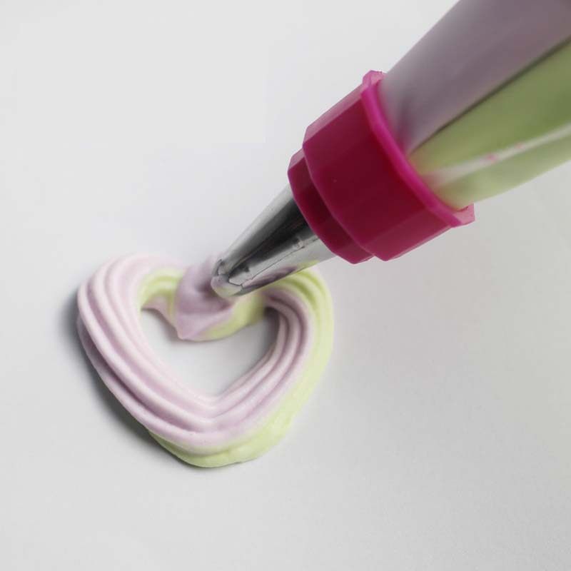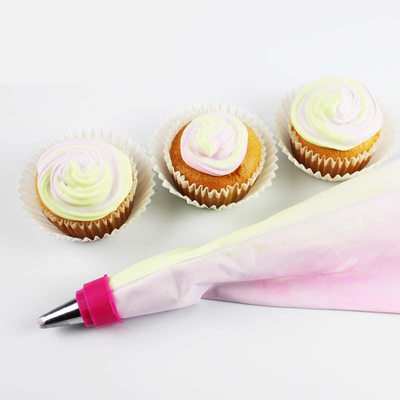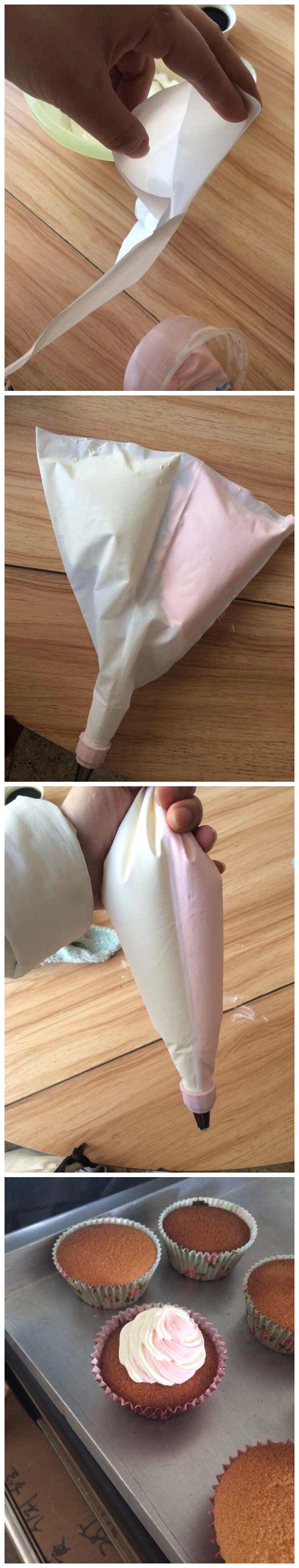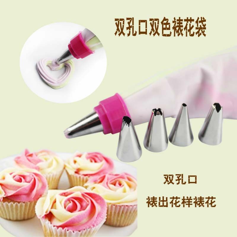 说明:可重复使用,左侧和右侧的袋子是隔离的,装入不同颜色的奶油霜,可以挤出拼色的效果,非常好看,并且有配有花嘴转换器的,只要更换裱花嘴,还可以挤出不同的纹路造型等,非常棒的产品