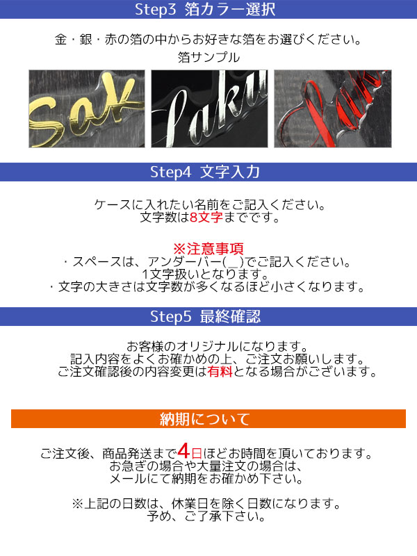 ケースはブラック・クリア、箔は金・銀・赤から、