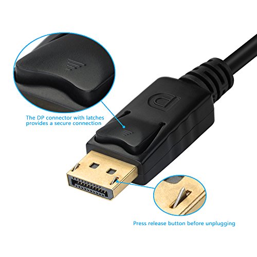 The DisplayPort connector with latches provides a secure connection with a release button, which need to be depressed before unplugging.