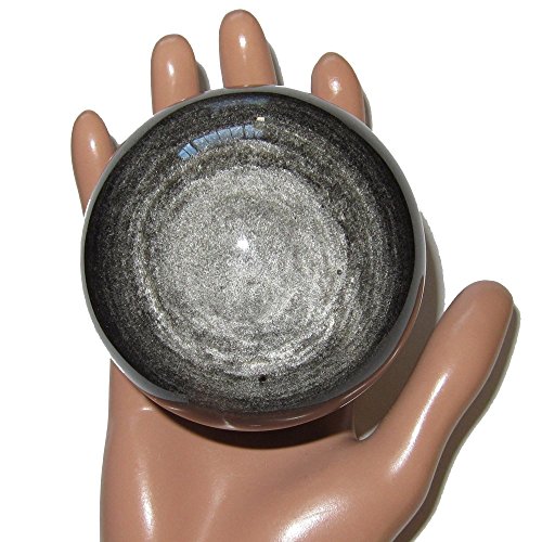 Your sphere is made from obsidian, which is volcanic glass. It appears black in normal lighting, with some white dimples and snowflake markings natural to obsidian. When placed in direct sunlight or very bright lighting, the sphere reveals wonderful silver sheen sparkles, with eye formations on both sides. One of a kind protective sphere hand picked by Satin Crystals for you. Receive this exact stone pictured when you order from Satin Crystals.