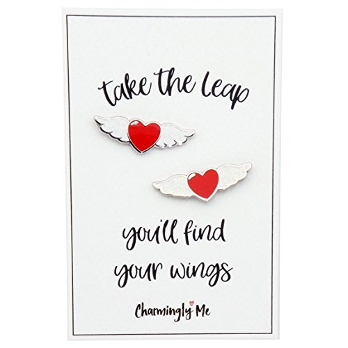 Studio : CharminglyMe Publisher : CharminglyMe Binding : Jewelry Product Description A set of two winged hearts arrive on a greeting card that reads "take the leap, you'll find your wings ". The two hearts are created from hand drawn sketches and measure approximately 3/4" with a secure rubber backing. 0