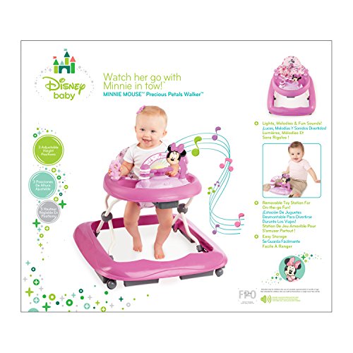 -. Binding : Baby Product -. Brand : Disney -. Color : Pink -. Department : Female -. EAN : 0074451601444 -. Feature : The toy station detaches so you can take Minnie anywhere you want / Includes 3 height positions to adjust as your baby grows / The high back seat provides extra support for baby / Lays flat for easy storage, and is easy to clean / Removable toy station allows baby to play on-the-go / Flower petal steering wheel activates lights and fun sounds -. Label : Disney -. Manufacturer : Disney -. Model : 60144 -. MPN : 60144 -. PackageQuantity : 1 -. PartNumber : 60144 -. ProductGroup : Baby Product -. ProductTypeName : BABY_PRODUCT -. Publisher : Disney -. Studio : Disney -. Title : Disney Baby Minnie Mouse Precious Petals Walker, Pink -. UPC : 074451601444 -. Warranty : 1 Year Kids II