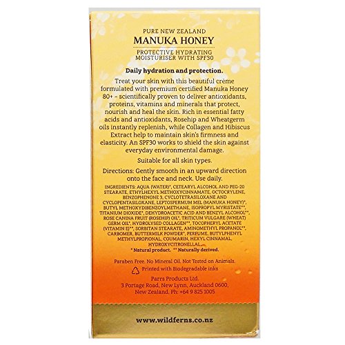 -. Feature : New version of the classical Wild Ferns Manuka Honey Replenishing SPF moisturizer / With pure Manuka Honey, Rosehip Oil, Wheatgerm Oil, Collagen and Hibiscus / For daily use to protect against environmental damage / No mineral oil not tested on animals